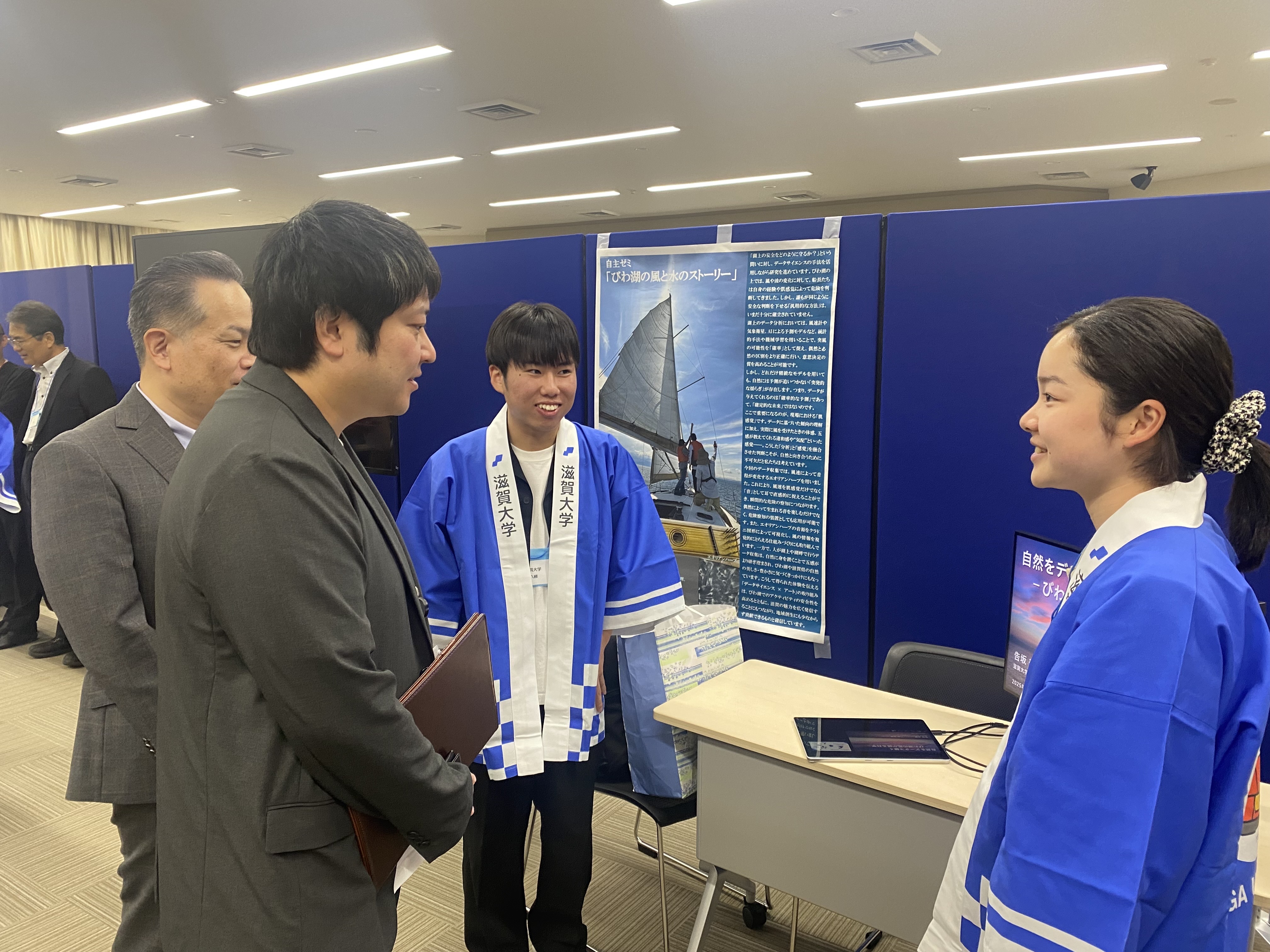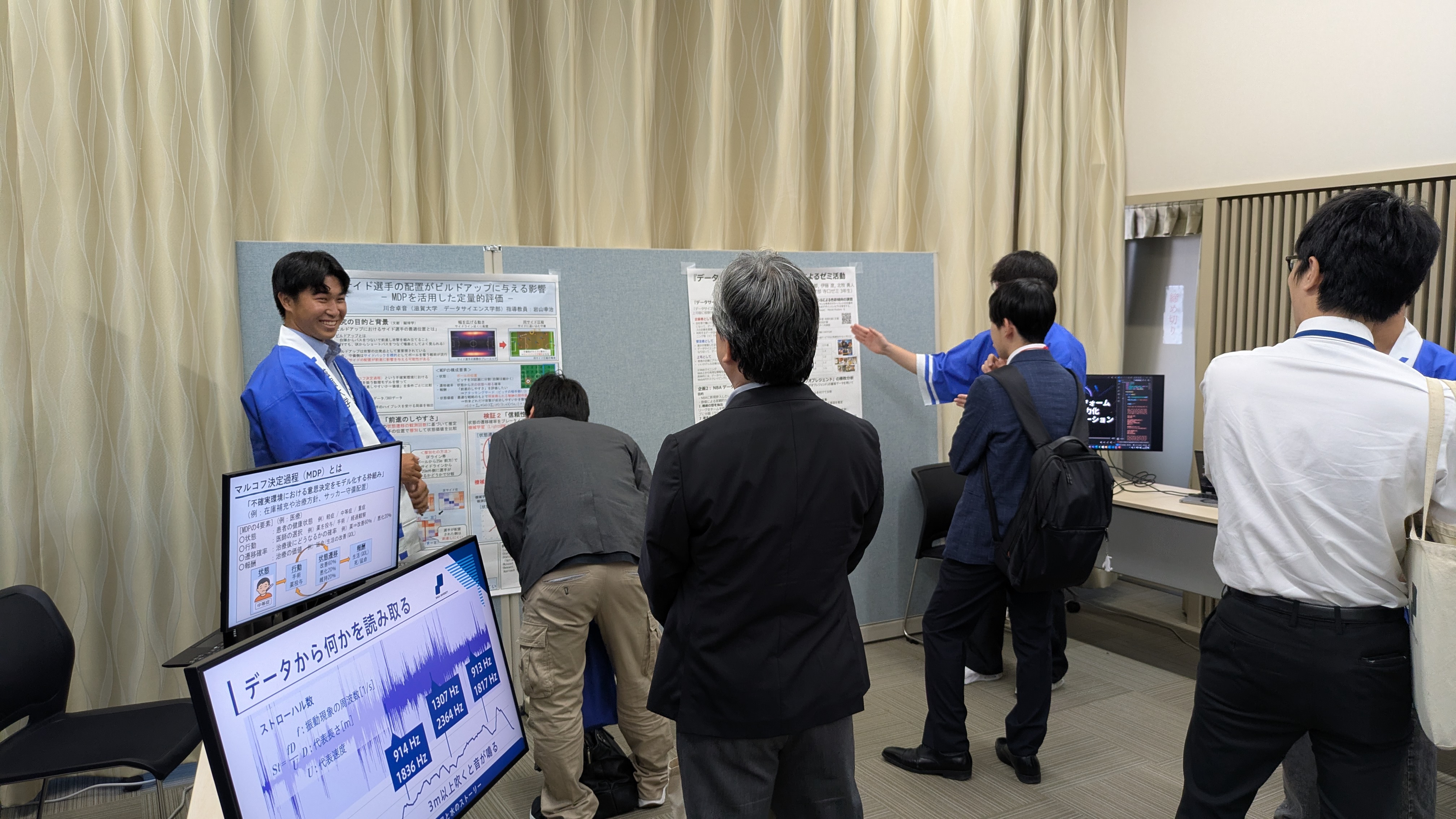 また、展示ブースでは、データサイエンス学部の岩山幸治ゼミ、寺口俊介ゼミに加え、深谷良治・大塚道子自主ゼミの学生が各ゼミでの研究テーマや活動内容を来場者に説明し、参加者同士での活発な意見交換・情報共有が行われました。参加した学生からは、「企業で働く方ならではの実践的な視点に触れ、研究に対する新たな気づきを得ることができた。今回の交流は自身の成長にもつながる大変貴重な機会となった」との声がありました。