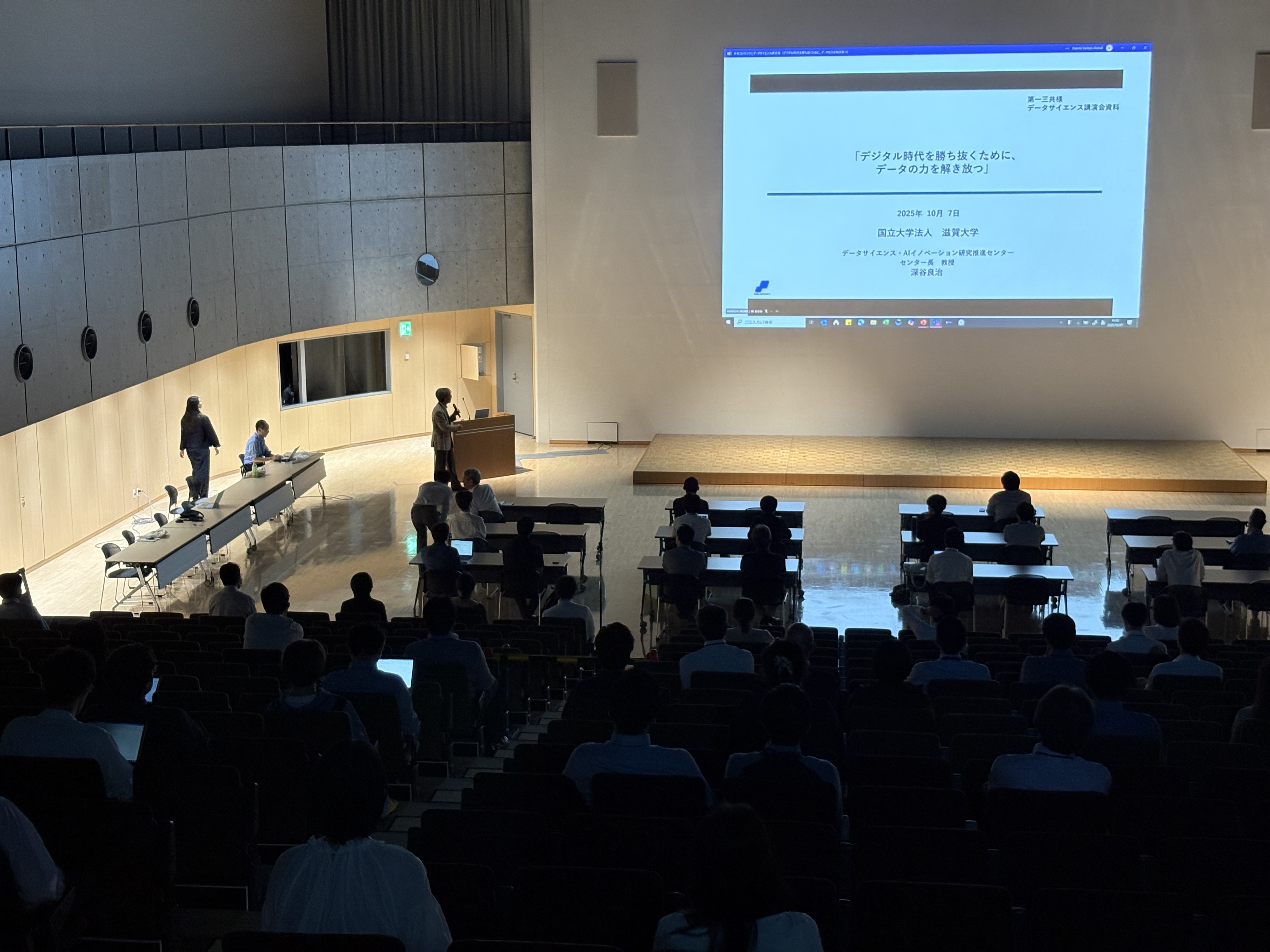 2025年10月7日、第一三共株式会社 品川研究開発センターにおいて、第一三共株式会社 データインテリジェンス部主催の「データサイエンス講演会」が開催されました。滋賀大学データサイエンス・AIイノベーション研究推進センターの深谷良治センター長が招かれ、「データで未来切り拓く意思決定 ― デジタル時代を勝ち抜くために、データの力を解き放つ ―」と題して特別講演を行いました。本講演は、第一三共株式会社の依頼により実施されたものです。