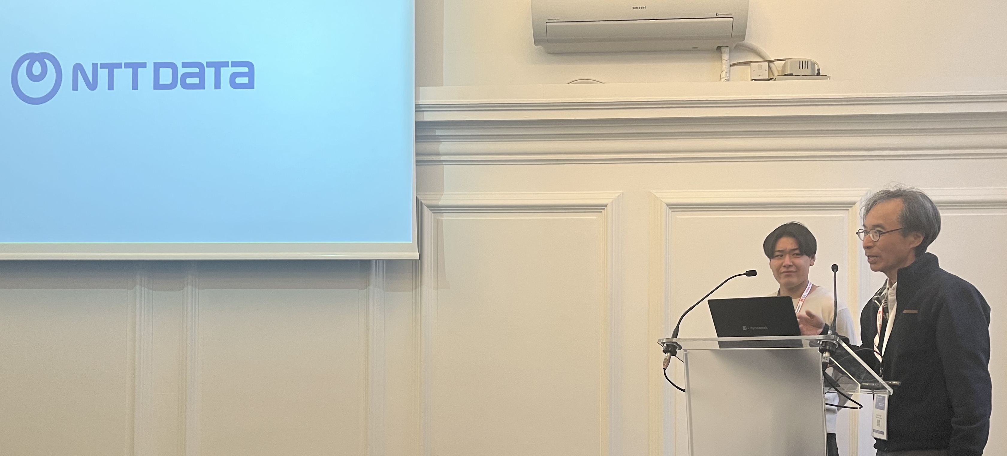 本発表は NTTデータの若手エンジニアが登壇して実施し、研究の背景・方法・システム実装のプロセスなどが説明されました。