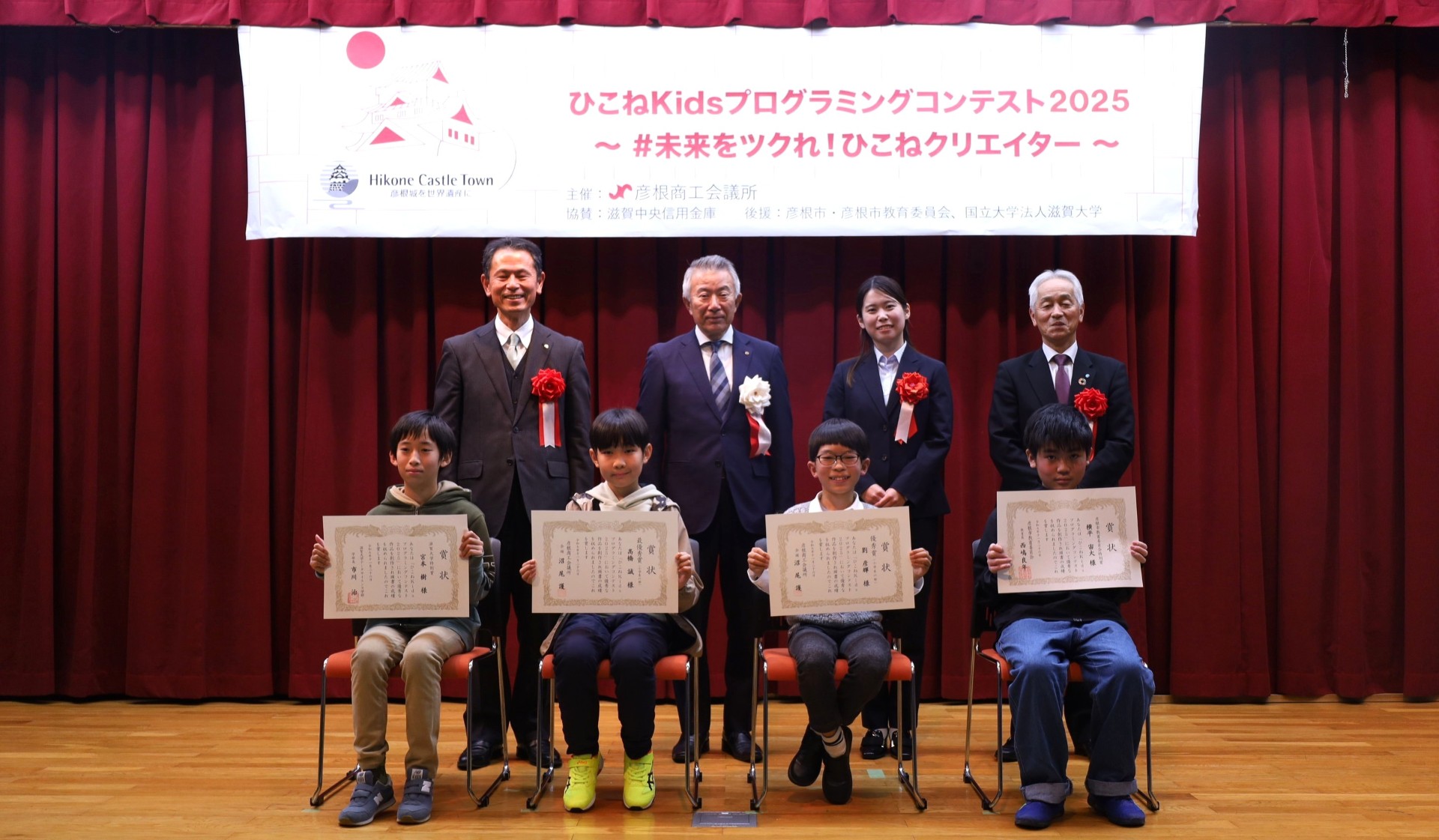 データサイエンス・AIイノベーション研究推進センター・千代延未帆助教は、2025年11月26日、彦根商工会議所が主催する「ひこねKidsプログラミングコンテスト2025〜#未来をツクれ!ひこねクリエイター〜」の表彰式に参加しました。ひこねKidsプログラミングコンテストは、地域の未来に向けた人材育成事業の展開として、彦根市内の小中学生を対象にしています。より多くの子ども達がプログラミングに興味をもつきっかけを作ると共に、プログラミングスキルの成果を発揮する場として開催されており、今年で6回目となりました。滋賀大学は後援として参加しています。