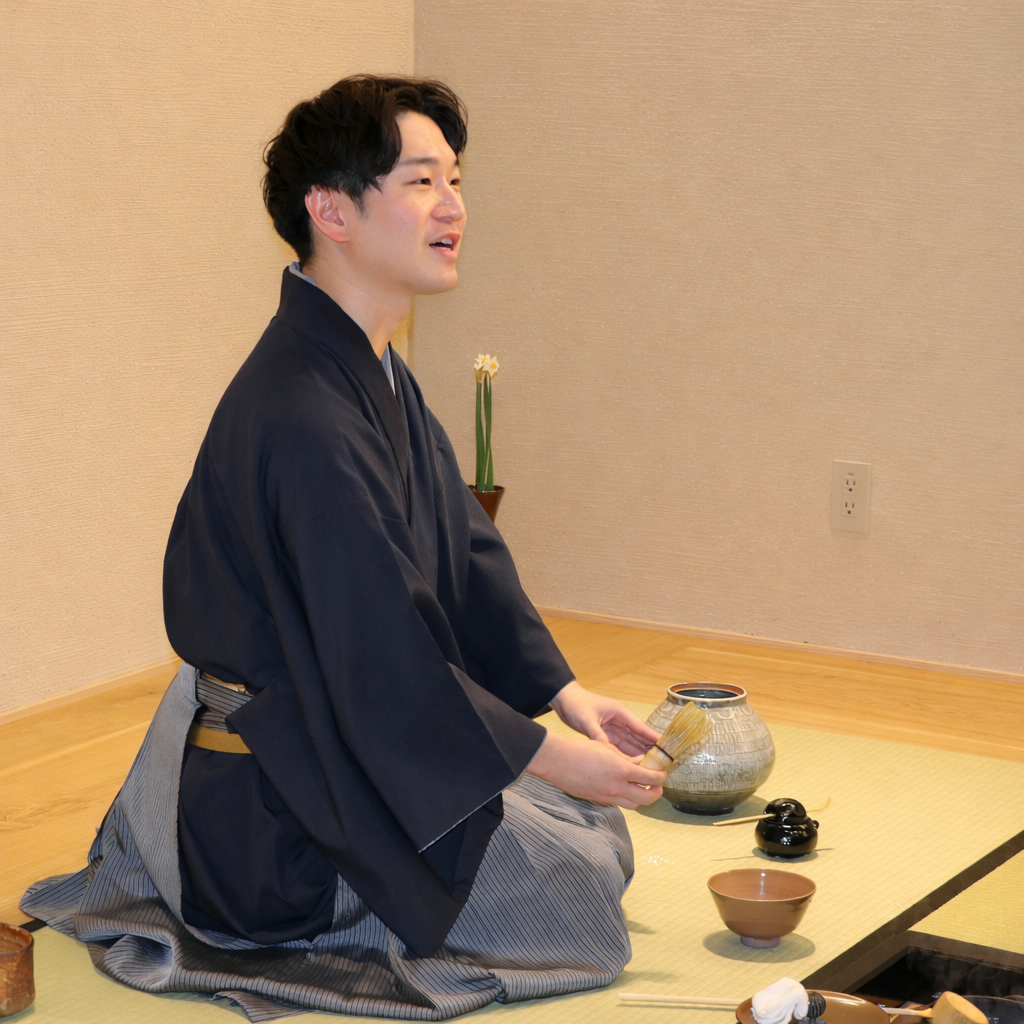 亭主を務めた米山慎太郎助教は、統計科学を専門とする研究者で、2025年12月に滋賀大学に着任されました。中学時代から約20年にわたり茶道を続けられ、当日は参加者に向けて、茶道の所作や心構えについても丁寧な説明を行われました。