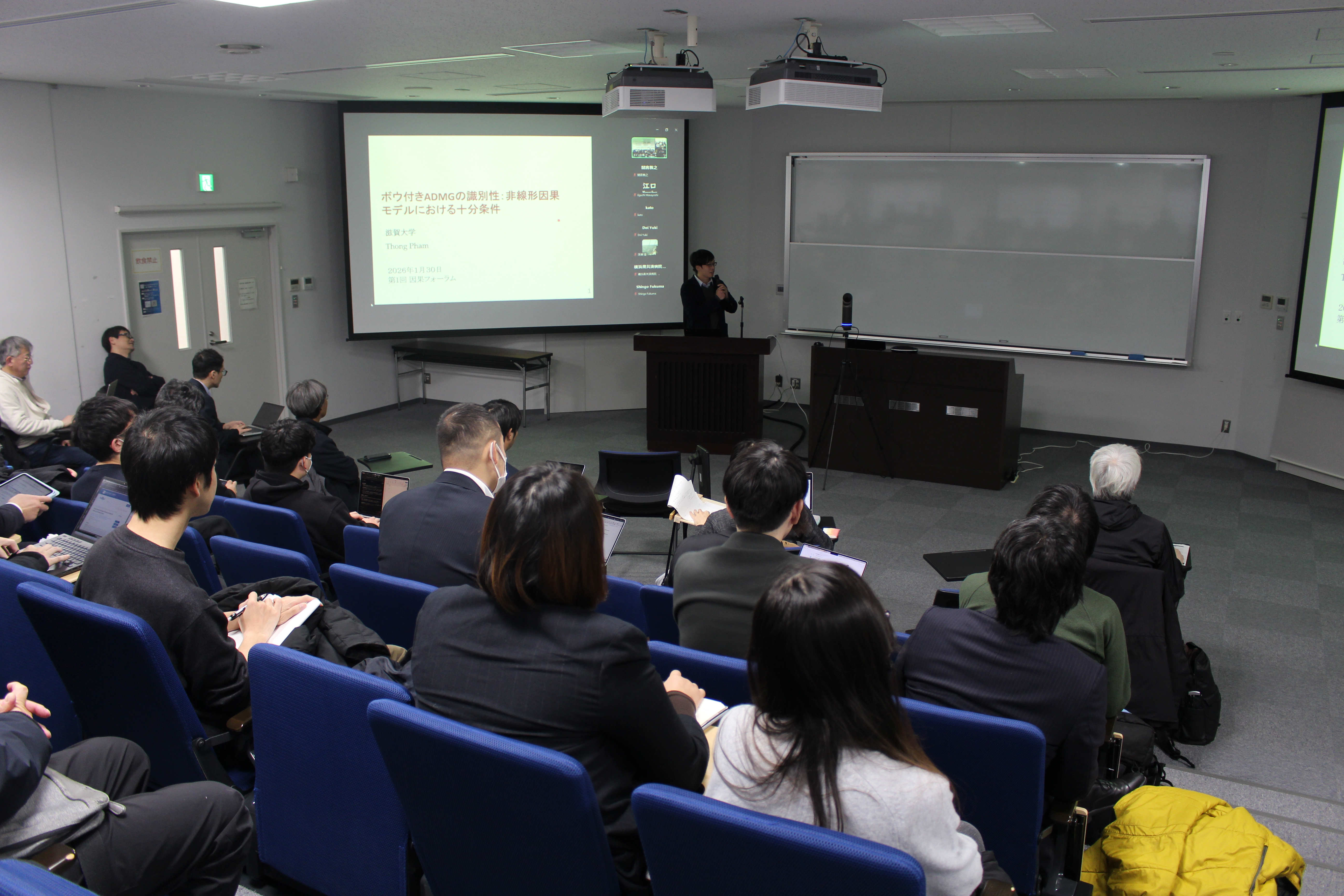 2026年1月29日(木)30日(金)の両日、滋賀大学彦根キャンパスにおいて「The First Causal Frontier Forum」を開催しました。本フォーラムは、滋賀大学データサイエンス・AIイノベーション研究推進センターが主催し、JST CRESTの協力、理化学研究所 革新知能統合研究センター(RIKEN AIP)の後援を得て実施されたもので、因果AIと予防統合科学を軸に理論から応用、社会実装までを横断する学際的な対話の場を提供することを目的としました。本フォーラムは、2025年9月に発足した先端因果推論特別研究チームの取組みの一環として位置づけられ、同チームが目指す研究推進と学内外連携の強化を具体化する重要な機会となりました。