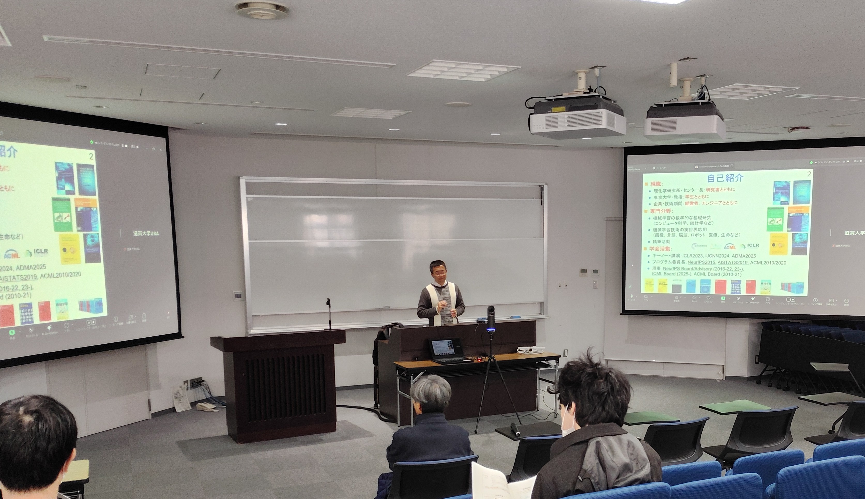 2026年2月16日、杉山 将 先生(理化学研究所 革新知能統合研究センター センター長/東京大学 大学院新領域創成科学研究科 複雑理工学専攻 教授/滋賀大学 データサイエンス・AIイノベーション研究推進センター 特別招聘教授)をお招きして、データサイエンスセミナーを開催しました。本セミナーでは、強化学習の発展についてお話しいただきました。強化学習とは、エージェントに最適な行動方策を獲得させるための枠組みで、行動の結果として得られる即時的な報酬をもとに、長期的な目標を達成できるよう行動規則を逐次的に改善していく機械学習の技術です。杉山先生は長年、機械学習の数学的な基礎研究を続けてこられ、その研究は、企業・技術機関の多岐にわたる課題に応用されています。強化学習は、ゲーム、ロボット、ドローンなど身の回りで見る機械の制御から、自動運転やインフラの管理、治療方針の最適化など、多方面へ応用されています。その技術の基礎となるのは、私たちがスマホを片手にクリックする何気ない動作であったり、飲むかどうかわからない薬の消費であったりといった、断片的かつ不完全な情報を有効活用する機械学習技術です。