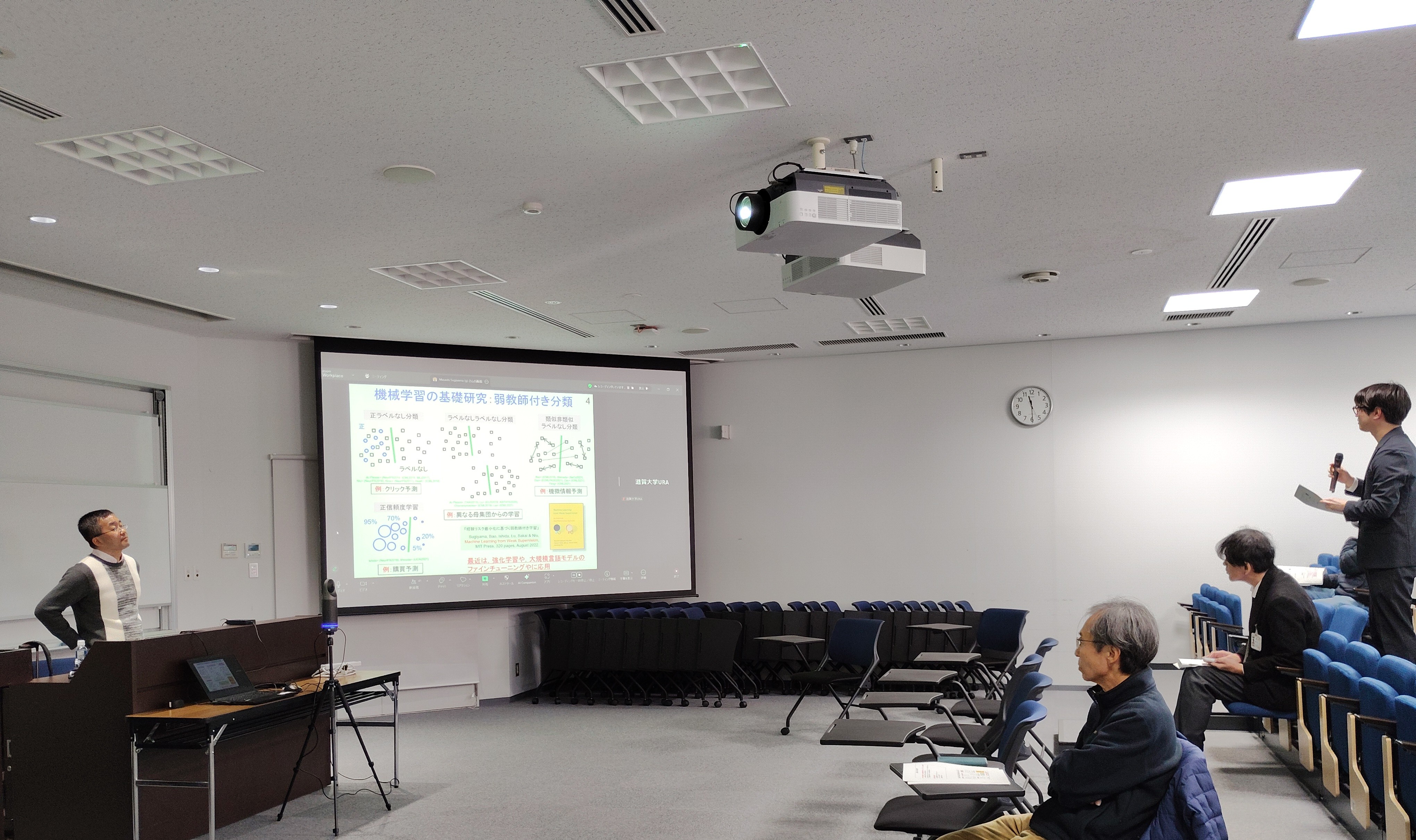 参加は教員・学生のほか、データサイエンス連携コンソーシアム企業会員も加わり、対面とオンラインを合わせて約60名の参加者が受講しました。多岐に渡る質問も寄せられ、機械学習の先端分野に関する知見を深める意義深いセミナーとなりました。来年度のセミナー(未定)では、今回の展開の新しい成果を伺うことができそうです。