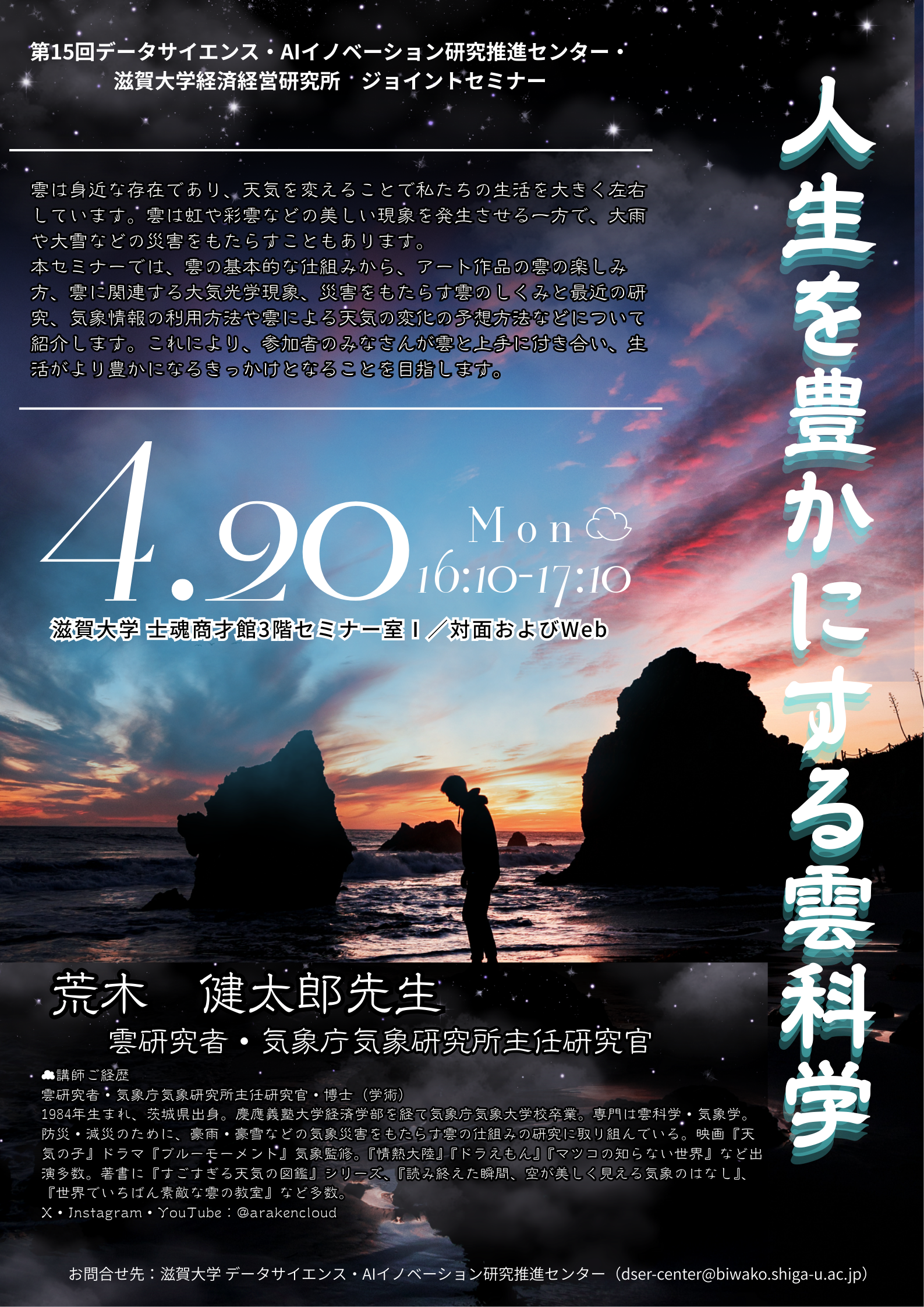 《2026年4月20日》データサイエンスセミナー(講演者:荒木 健太郎 先生 題目:「人生を豊かにする雲科学」)(第15回 データサイエンス・AIイノベーション研究推進センター・経済経営研究所ジョイントセミナー)